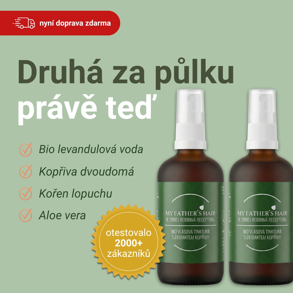 Náš příběh:Před 30 lety se můj táta začal potýkat s nepříjemným, v dnešní době zcela běžným problémem vypadávaní vlasů. Vyzkoušel nespočet různých přípravku, které byly dostupné na trhu, ale bohužel nic nezabíralo, a tak se rozhodl vyrobit svůj vlastní elixír na vlasy. Jako hlavní přísadu zvolil blahodární rostlinu kopřivu dvojdomou. Vyzkoušel mnoho způsobů zpracování kopřivy až došel k receptuře, kterou používá dodnes on i celá naše rodina. Tátovi je dnes 70 let a pořád má zdravé vlasy :)Společnost My Father's Hair s.r.o. vznikla v červnu roku 2018, poté co jsme se společně rozhodli podělit se o náš rodinnej poklad se světem.